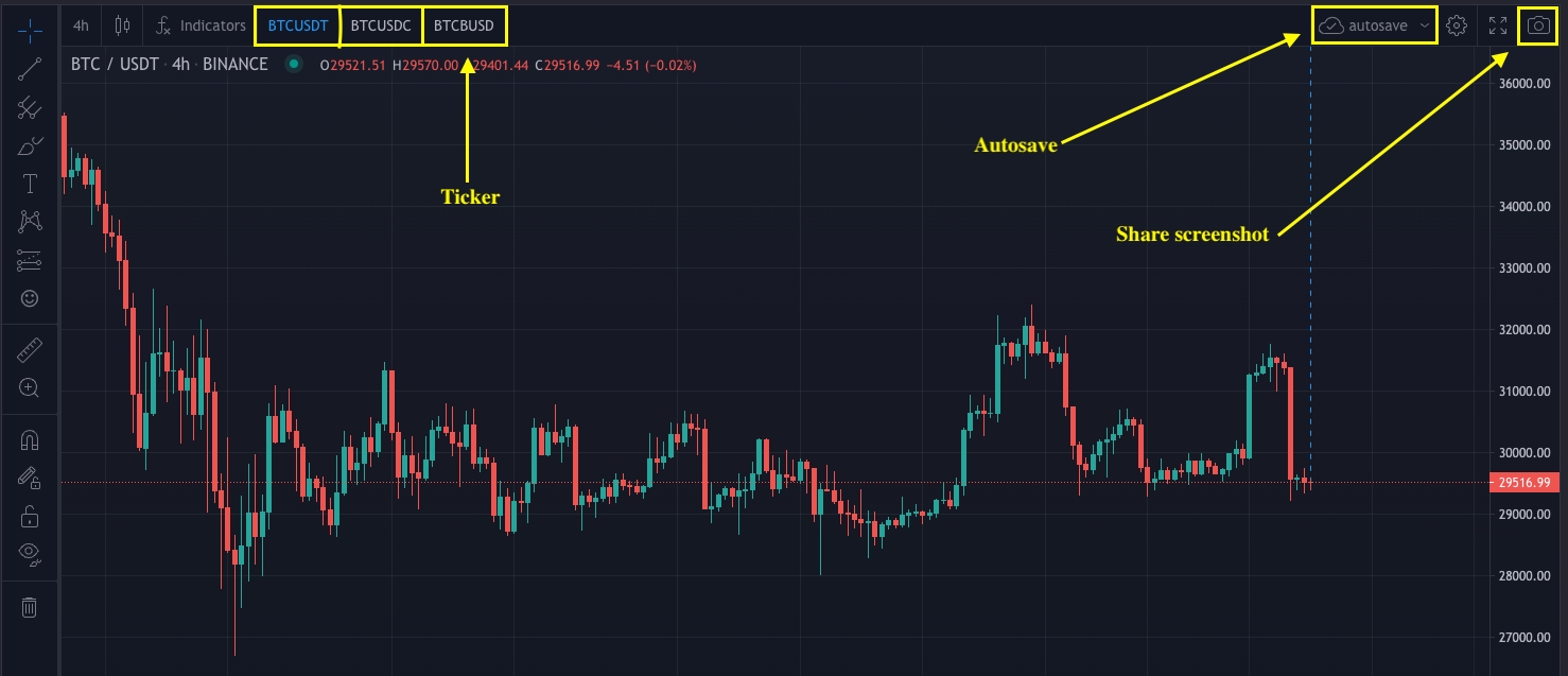 All your markup for each exchange or selected trading pair will be saved automatically. Autosave of markup on the chart is done every 5 seconds.