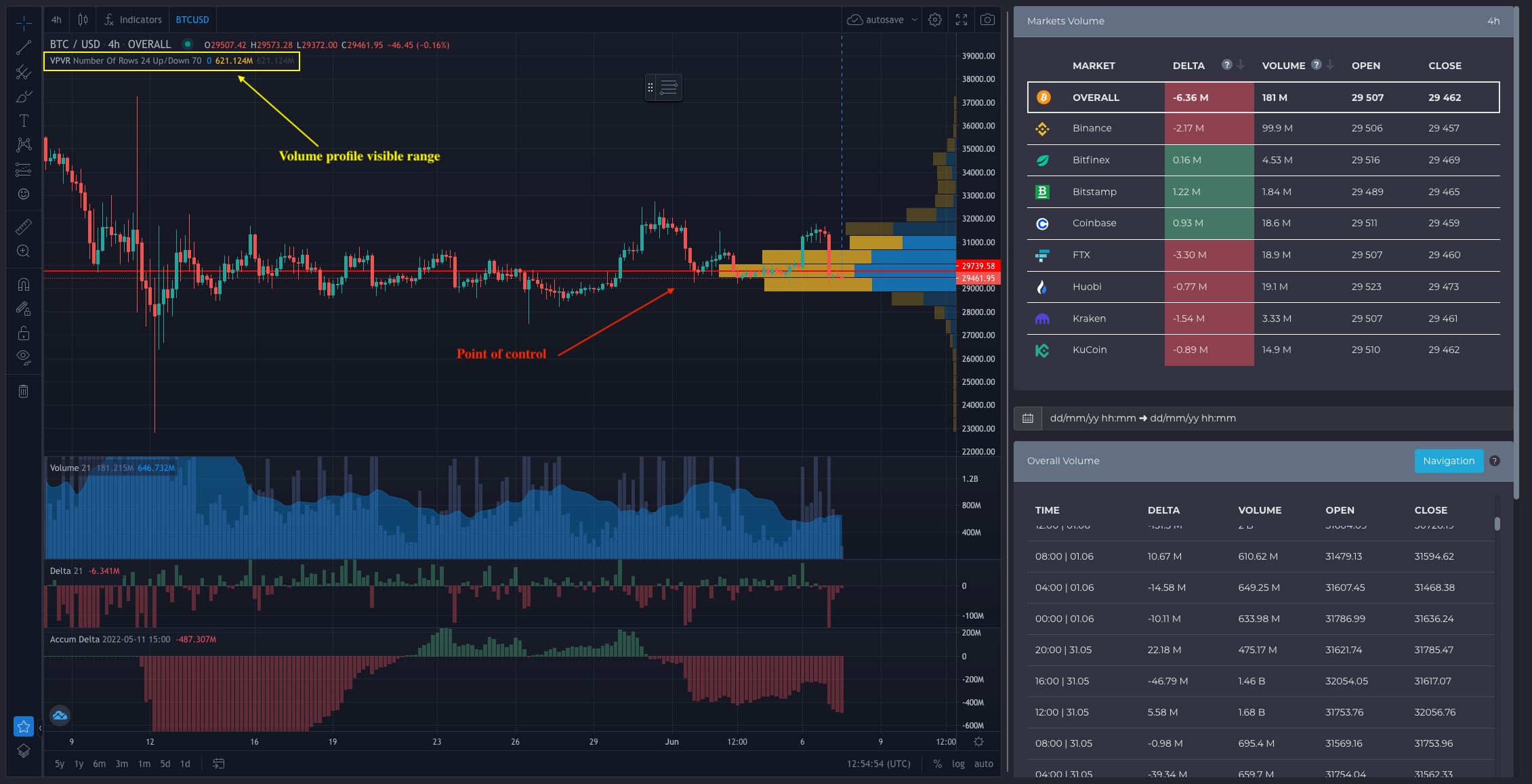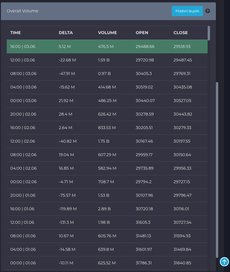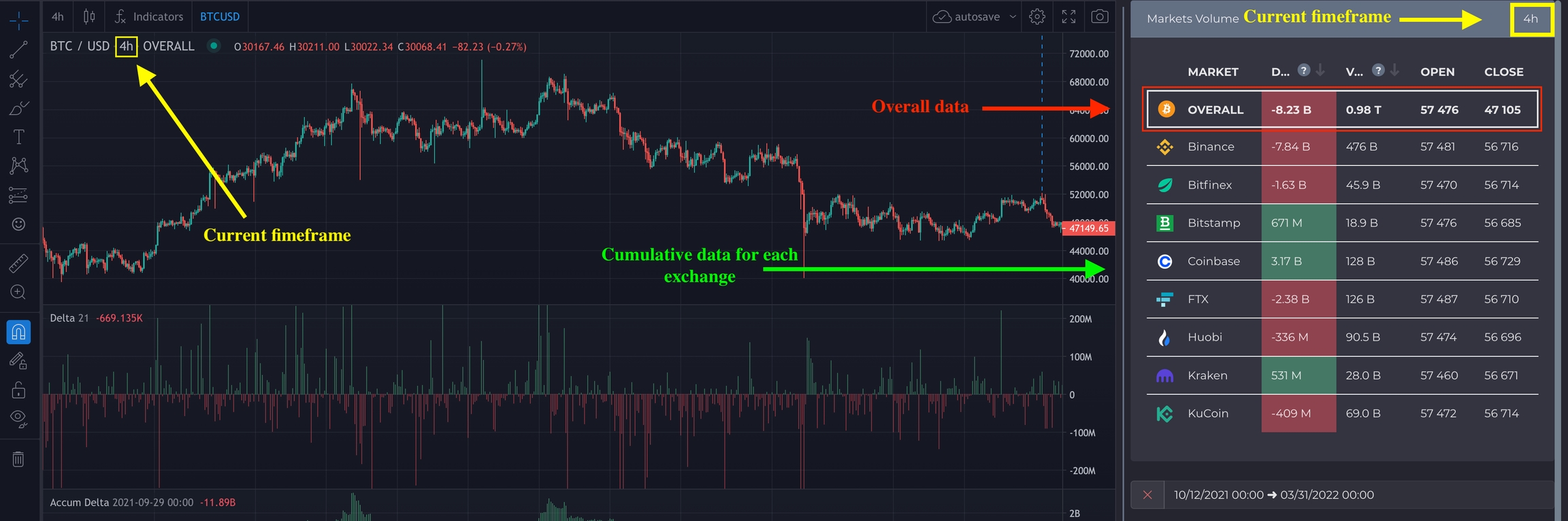 The trading volume indicator and the TradingView delta indicator correspond to the data of the Overall Volume block. All calculations are made in USDT and USD.