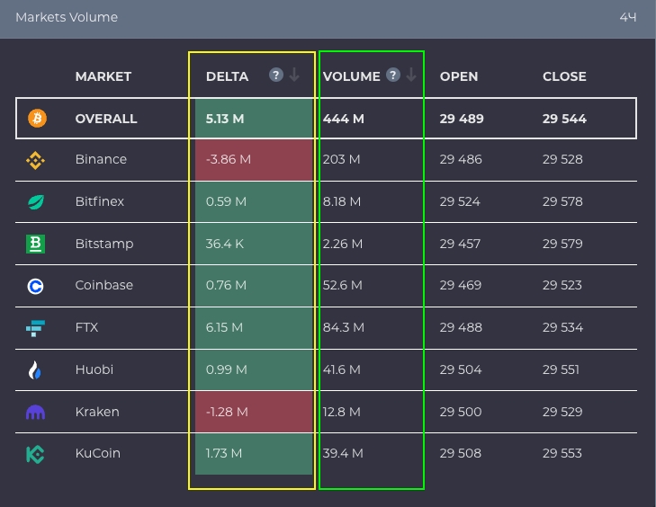 You can set the required time range for the Markets Volume block. This will allow you to find out the cumulative delta and trading volume for all exchanges together and for each separately.