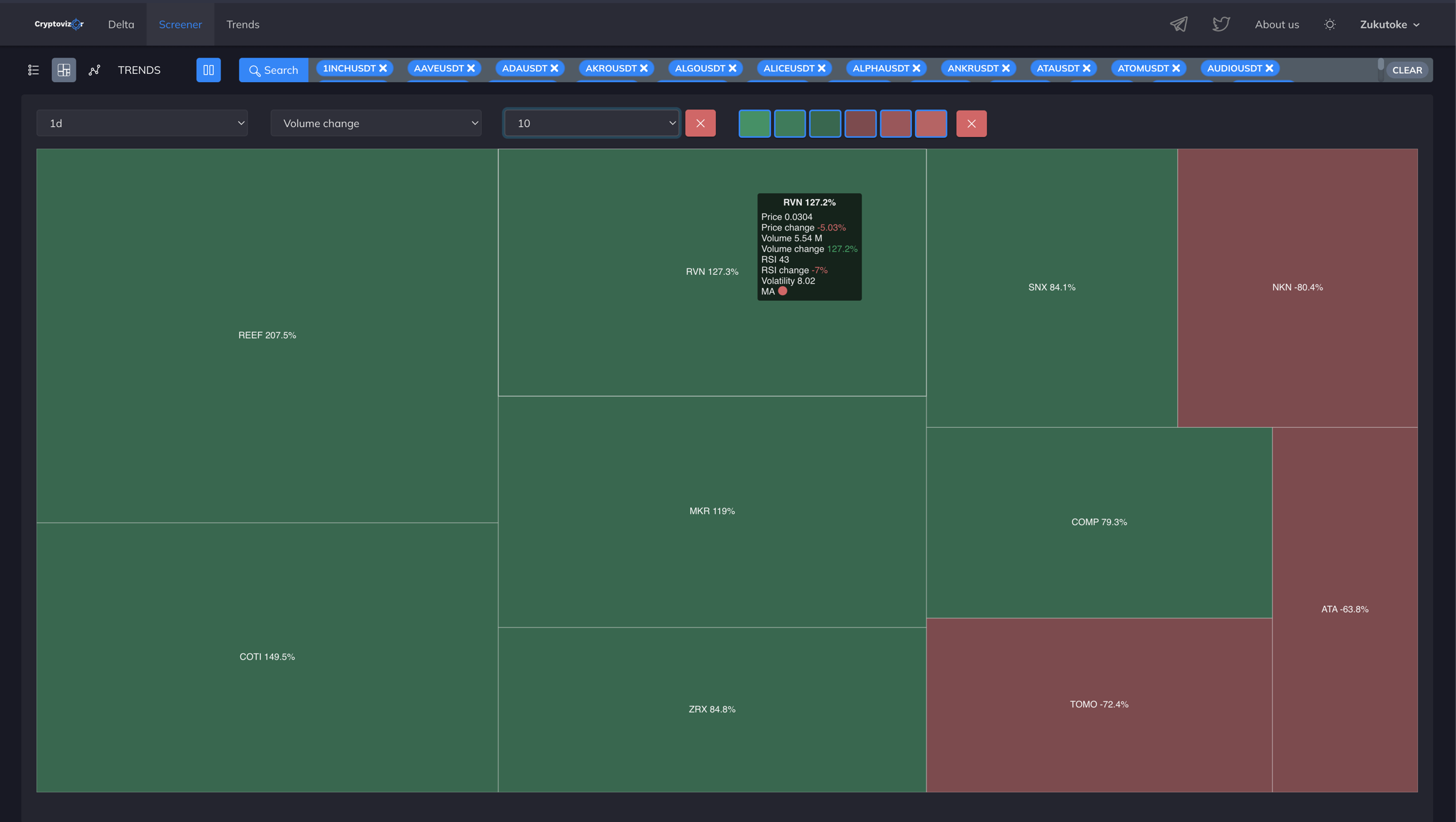 And the brightness of the cell directly depends on the value of Volume (trading volume). Light green or red indicates the highest trading volume, while dark color indicates the lowest trading volume among the selected coins.