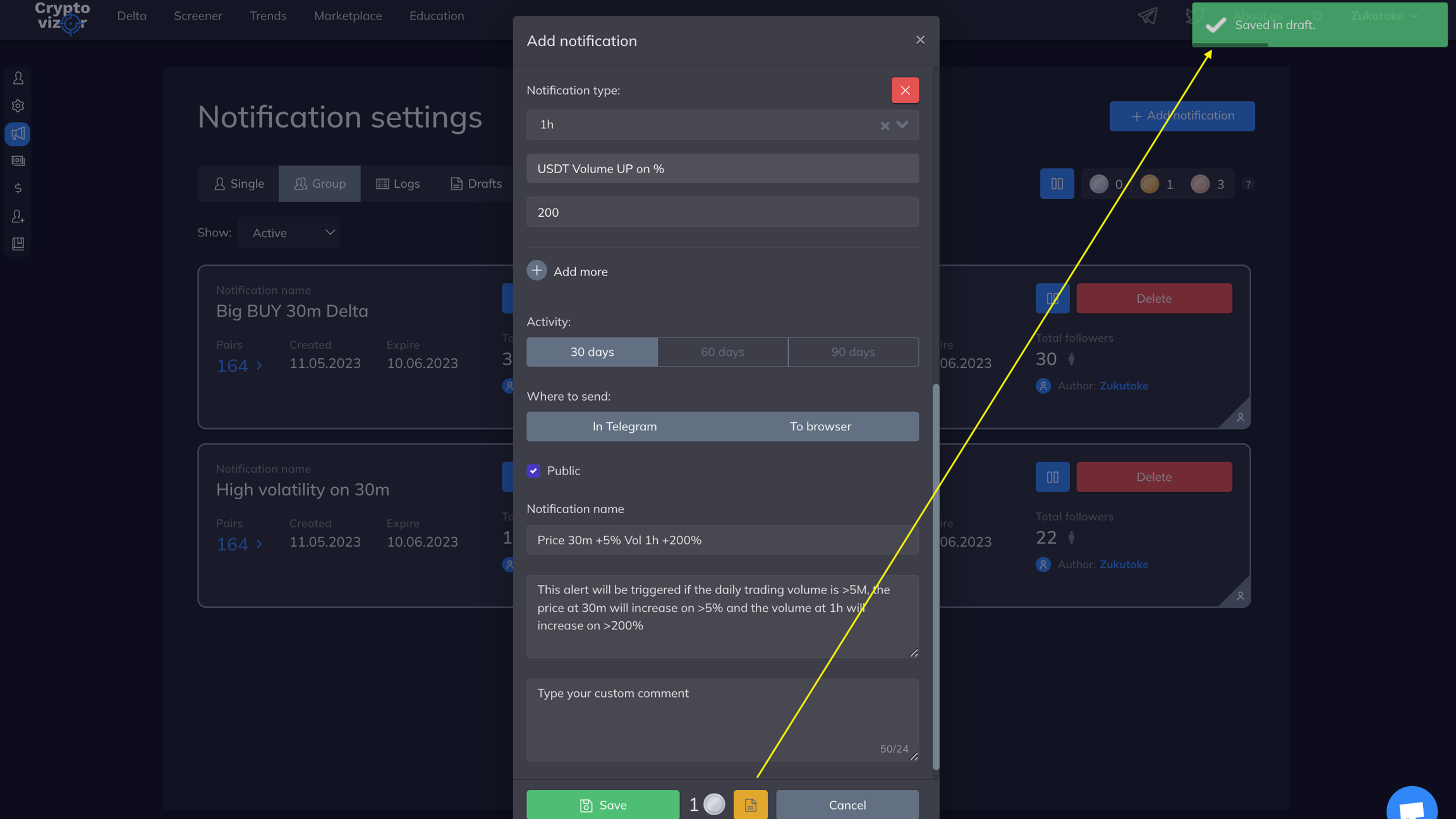 If you want to put your alert in the Marketplace, check "Public", then for >10 subscribers of your alert you will get +1 🟡 Token Influencer