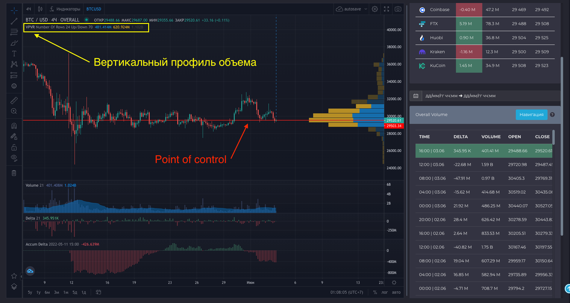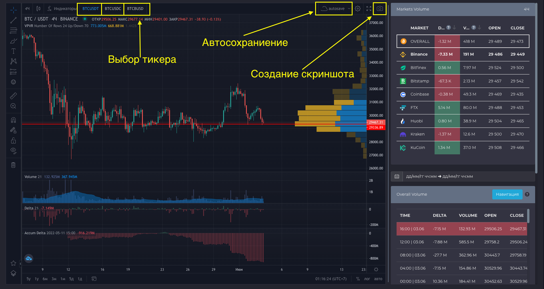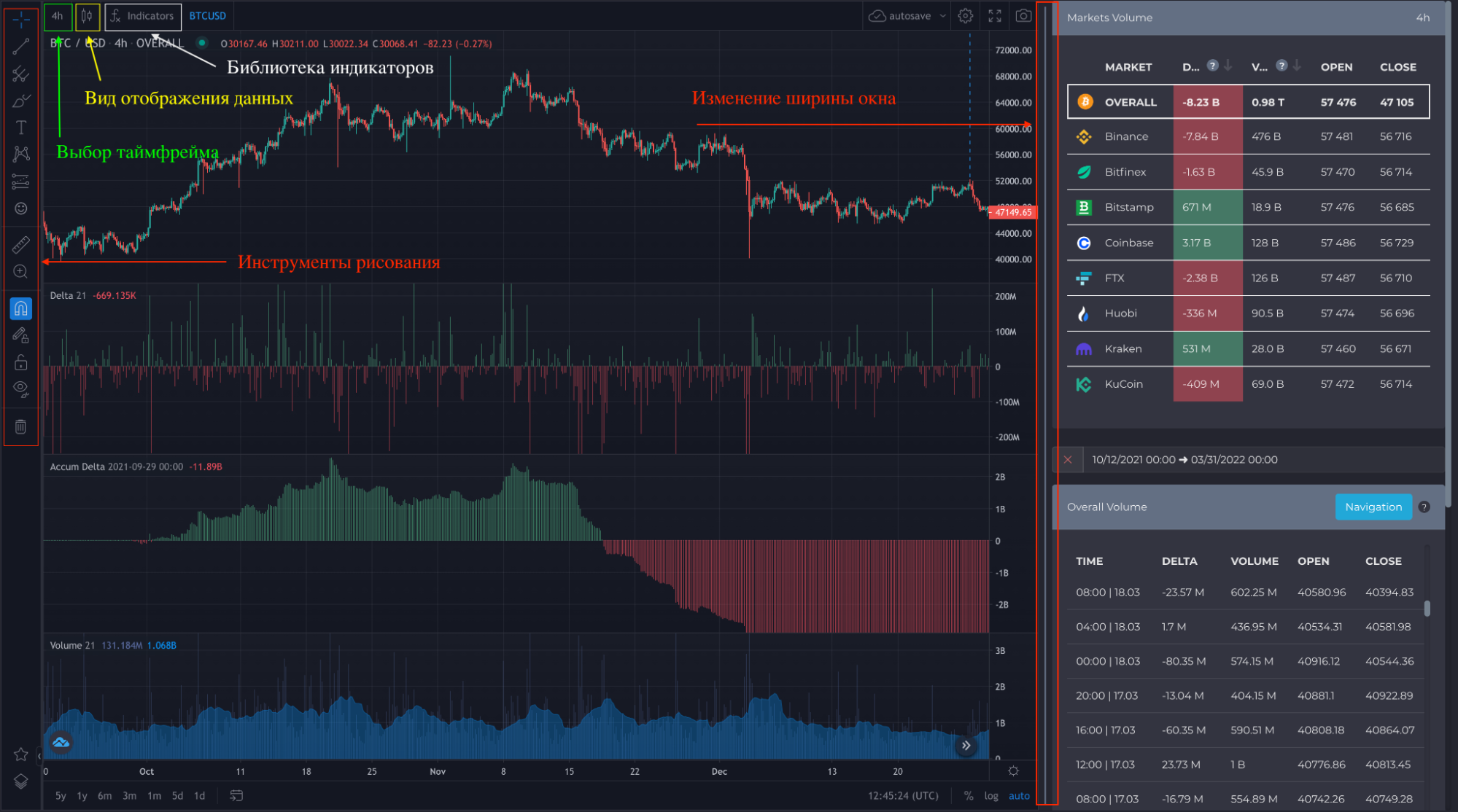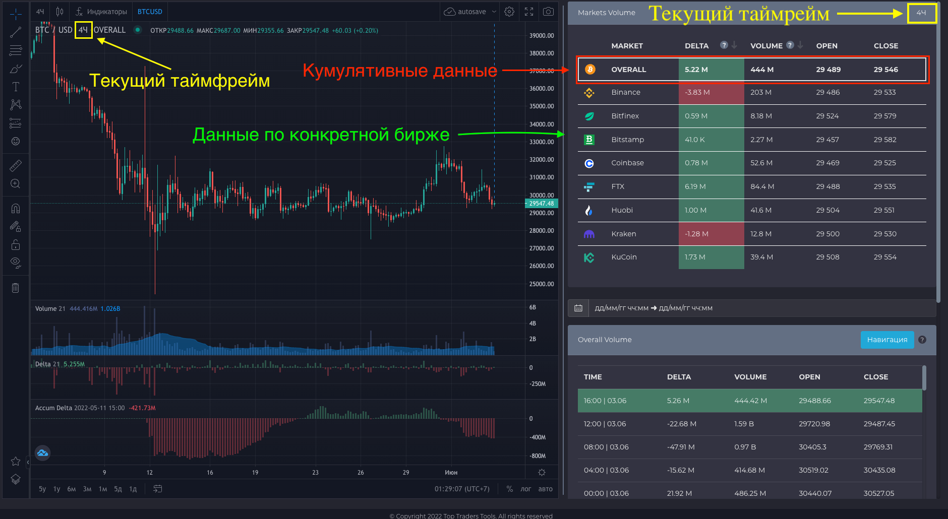 Индикатор объема торгов и индикатор дельта TradingView (delta chart) соответствуют данным блока Overall Volume. Все расчеты производятся в USDT и USD.