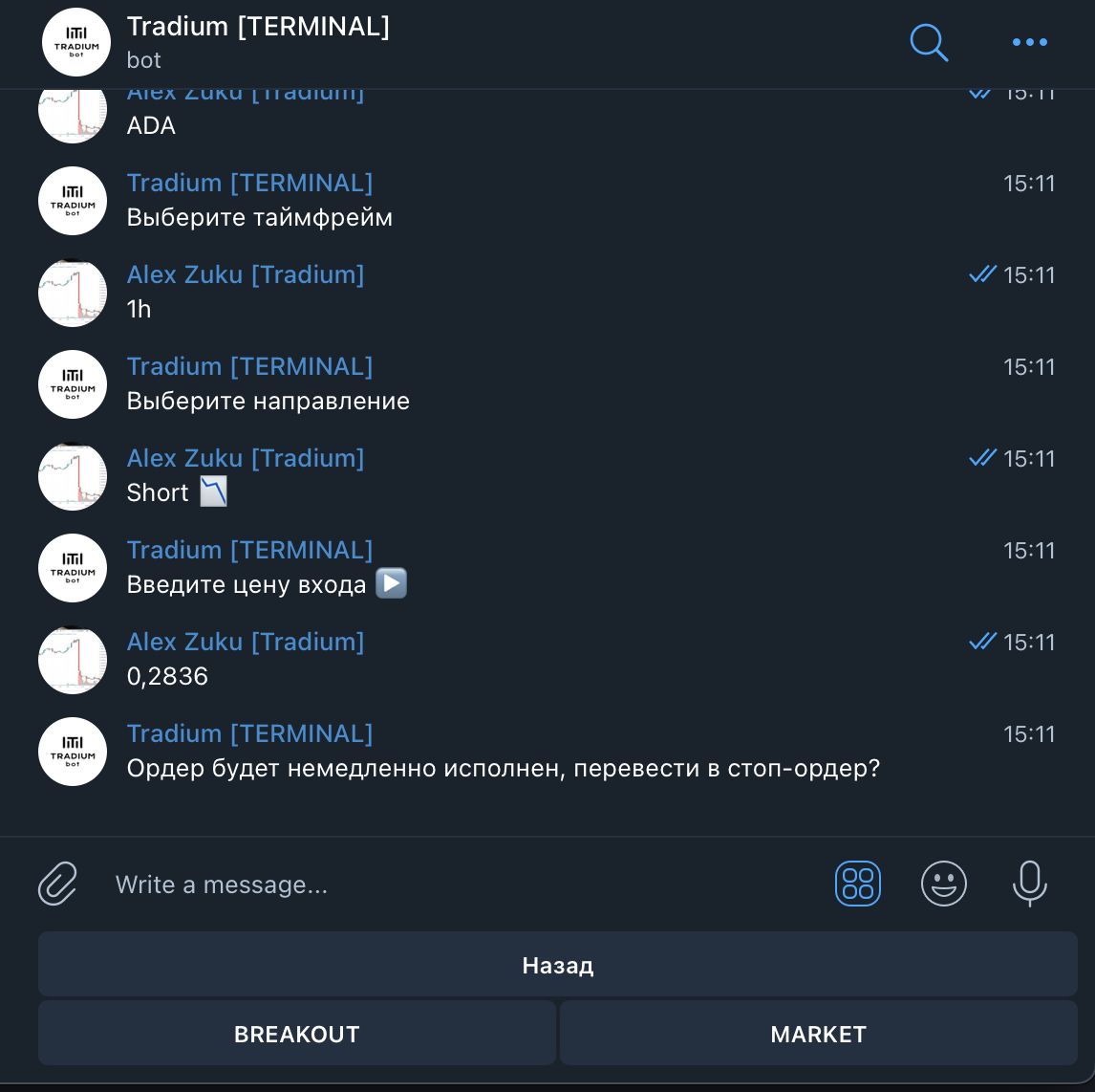 В случае с шортом, если текущая цена выше точки входа, то бот предлагает разместить Breakout ордер (на пробой) или Market (по текущей цене).